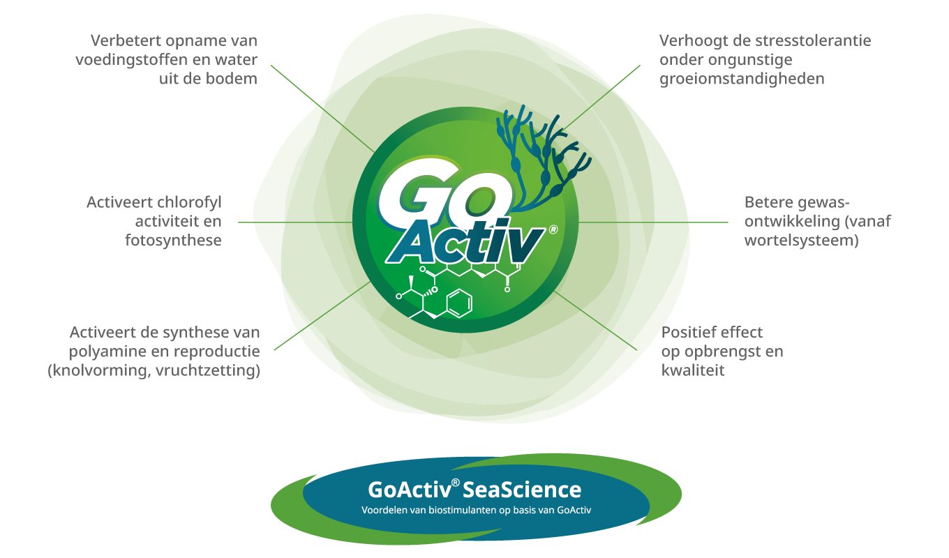 GoActiv® is een UPL basis-biostimulant die is afgeleid van de extractie en filtratie van Ascophyllum nodosumzeewier. De gebruikte techniek levert een zeer zuiver filtraat op. Het bevat een aantal actieve stoffen met bewezen werkingsmechanismen op plantactiviteit en voordelen voor de teelt van gewassen. GoActiv® vormt de basis van diverse UPL biostimulanten.